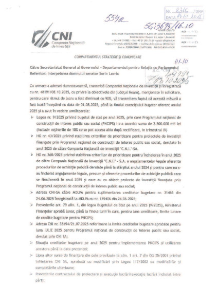 Compania Națională de Investiții a oferit un răspuns oficial, plin de trimiteri legislative, la interpelarea senatorului Sorin Lavric privind mai multe proiecte blocate în județul Neamț. Senatorul dorea să afle criteriile alocării și viabilitatea acestora, însă comunicarea CNI rămâne neconcludentă.