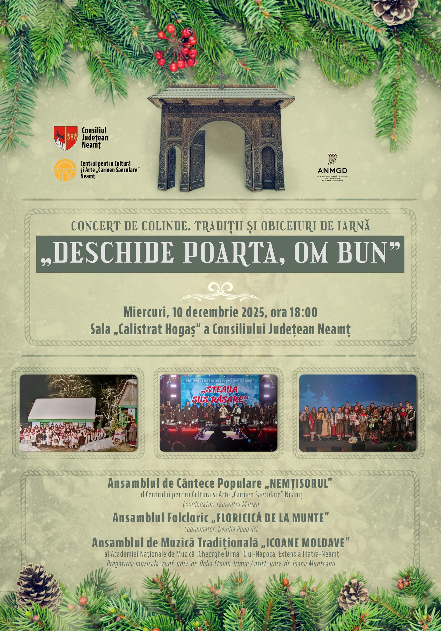 Primul eveniment din seria pregătită pentru sărbătorile de iarnă de Centrul pentru Cultură și Arte „Carmen Saeculare” Neamț va fi concertul „Deschide poarta, om bun”. Acesta reunește trei ansambluri folclorice apreciate de publicul local, aducând în fața spectatorilor tradiții autentice.