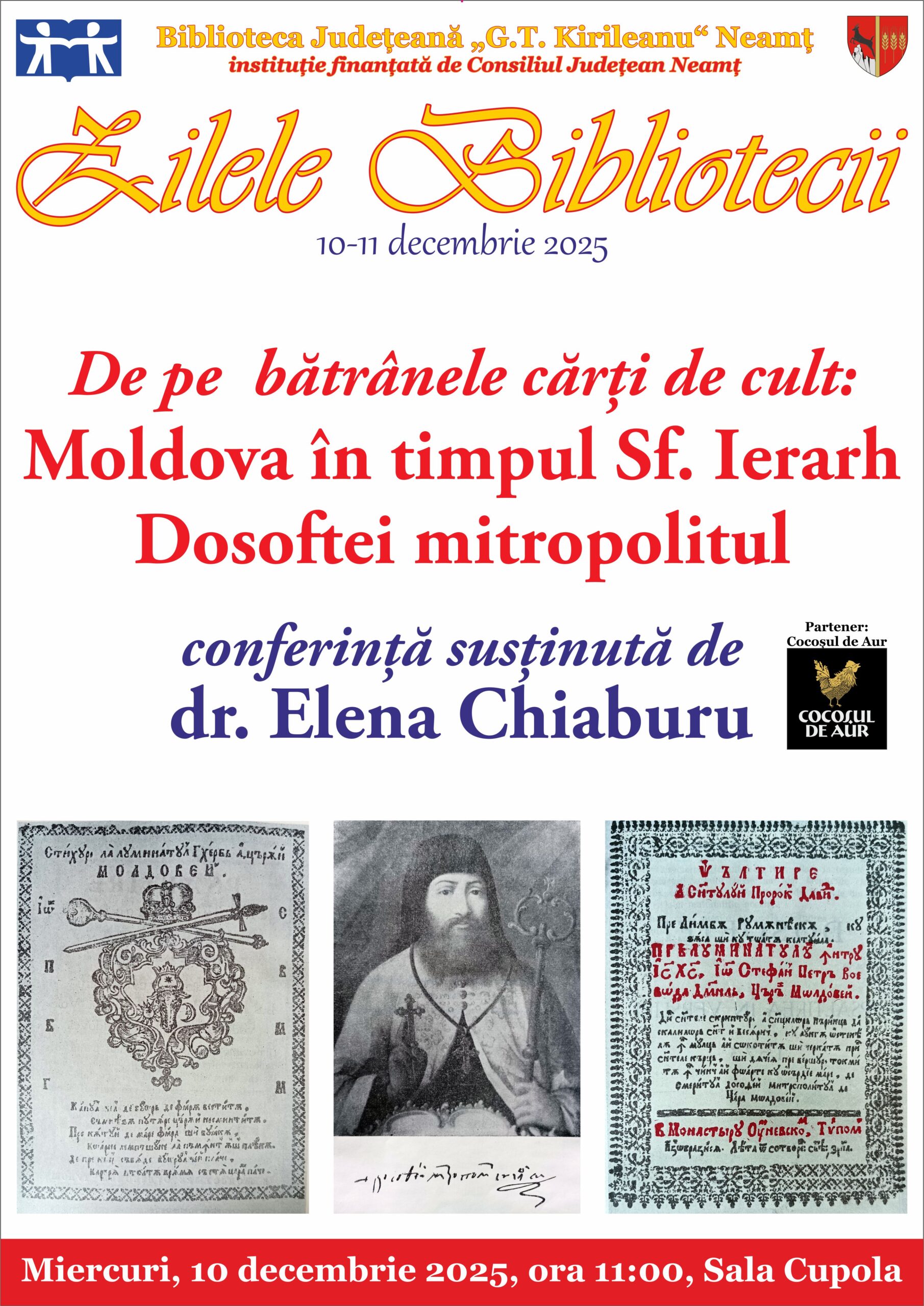 Biblioteca Județeană „G.T. Kirileanu” Neamț găzduiește miercuri, 10 decembrie, o conferință dedicată Moldovei din timpul mitropolitului Dosoftei. Evenimentul face parte din programul Zilelor Bibliotecii și va avea loc în Sala Cupola, începând cu ora 11:00.