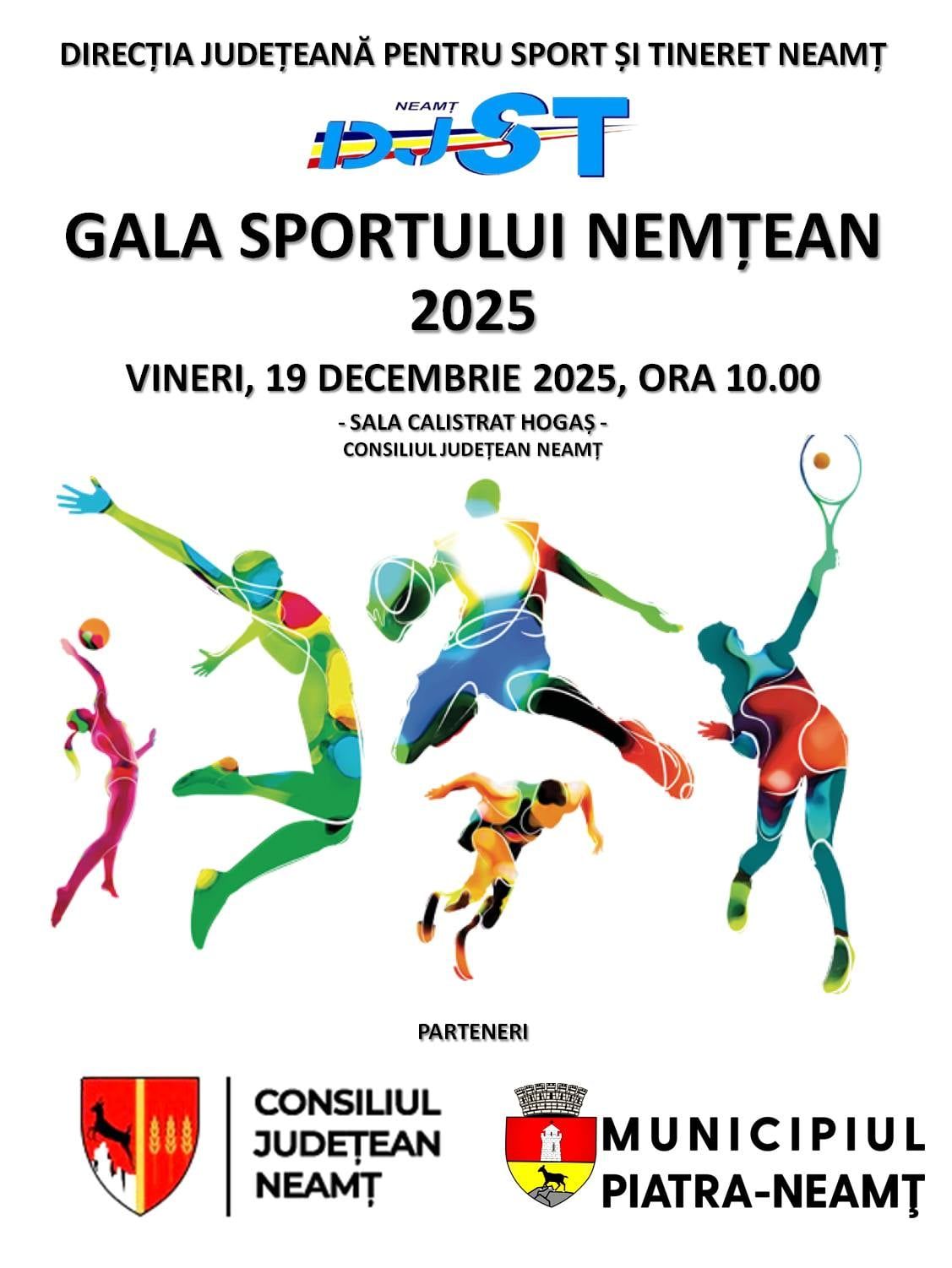Consiliul Județean Neamț a decis să se asocieze cu Direcția Județeană pentru Sport și Tineret Neamț pentru organizarea „Galei Sportului Nemțean 2025”, care va avea loc pe 19 decembrie 2025. Evenimentul va fi găzduit în sala „Calistrat Hogaș” a Consiliului Județean Neamț, iar potrivit unui comunicat al instituției, sunt premiați sportivii și antrenorii cu performanțe remarcabile.
