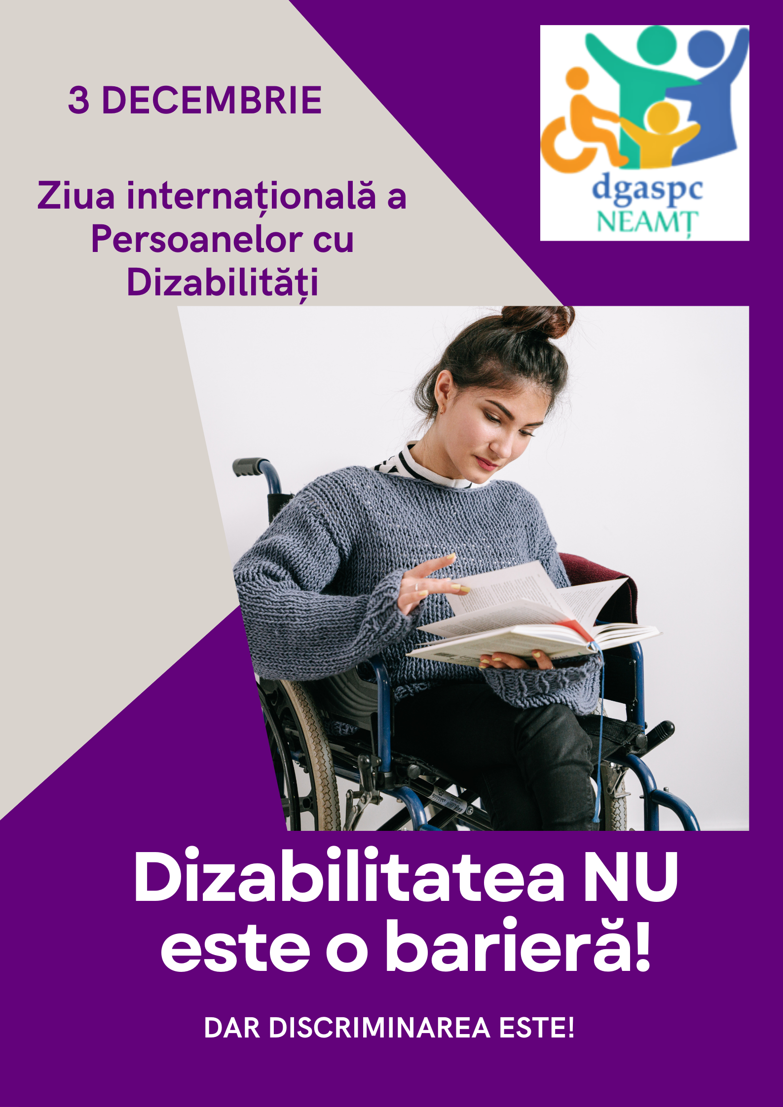 În această zi, centrele coordonate de DGASPC Neamț organizează evenimente și ateliere dedicate conștientizării drepturilor persoanelor cu dizabilități, iar sediul din Piatra Neamț va fi iluminat în violet, simbol al respectului și sprijinului pentru această categorie socială.