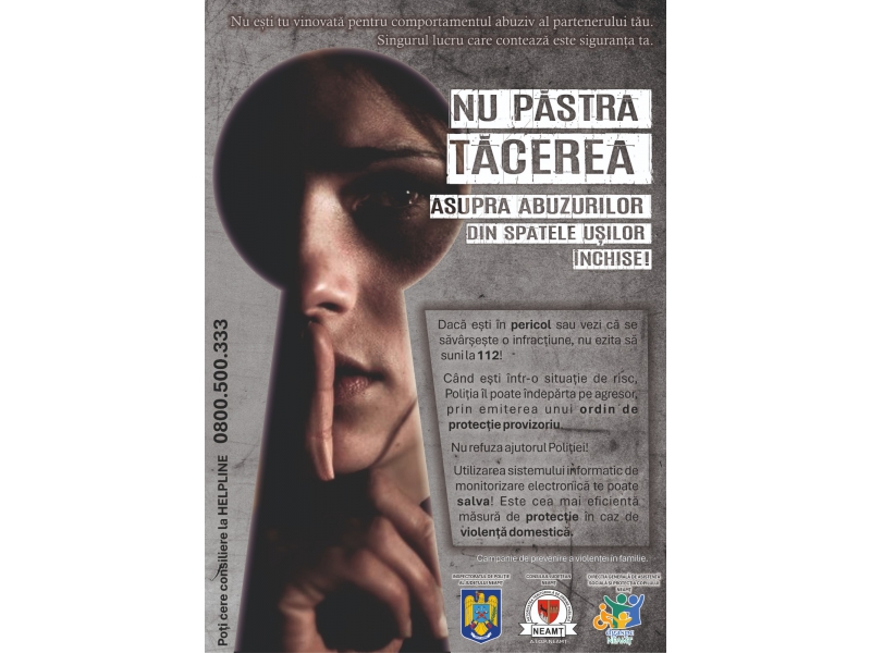 În acest an, de Ziua internațională pentru eliminarea violenței asupra femeilor, IPJ Neamț a prezentat un nou material video cu mărturii ale unei victime care a ales să vorbească despre abuzurile suferite. „Continuăm demersul de a aduce în atenția publică mărturii autentice ale victimelor violenței domestice”, transmit reprezentanții poliției.