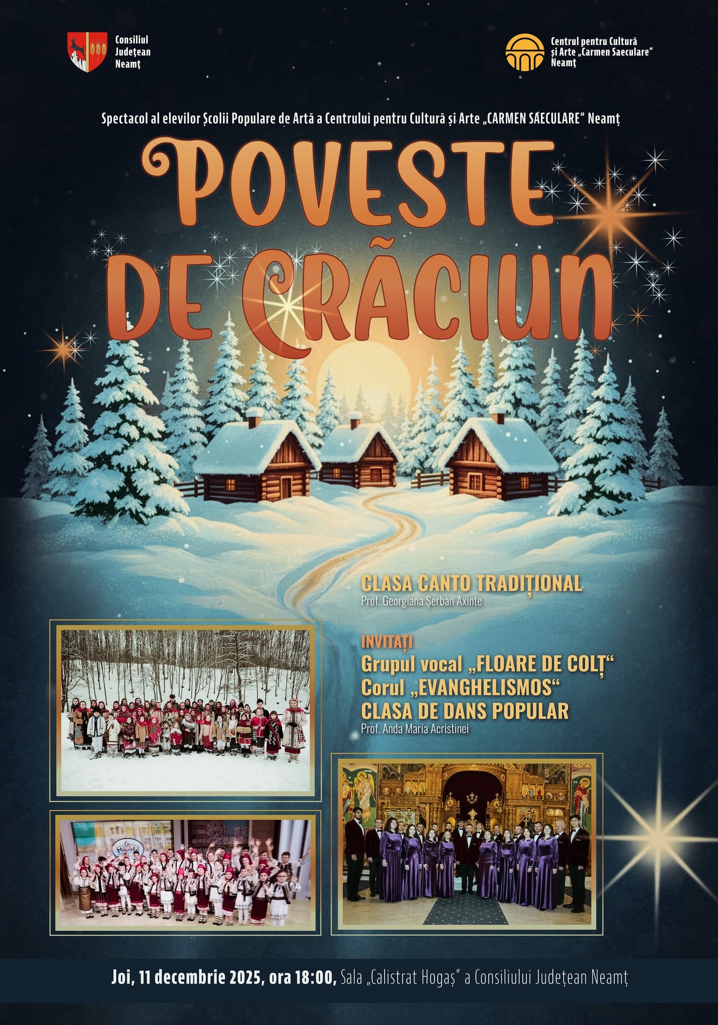 Un moment deosebit al serii îl vor constitui invitații speciali, grupul „Evanghelismos”, care vor interpreta colinde psaltice și tradiționale, adăugând profunzime programului artistic. Spectacolul va începe joi, 11 decembrie 2025, la ora 18:00, în sala „Calistrat Hogaș” a Consiliului Județean Neamț.