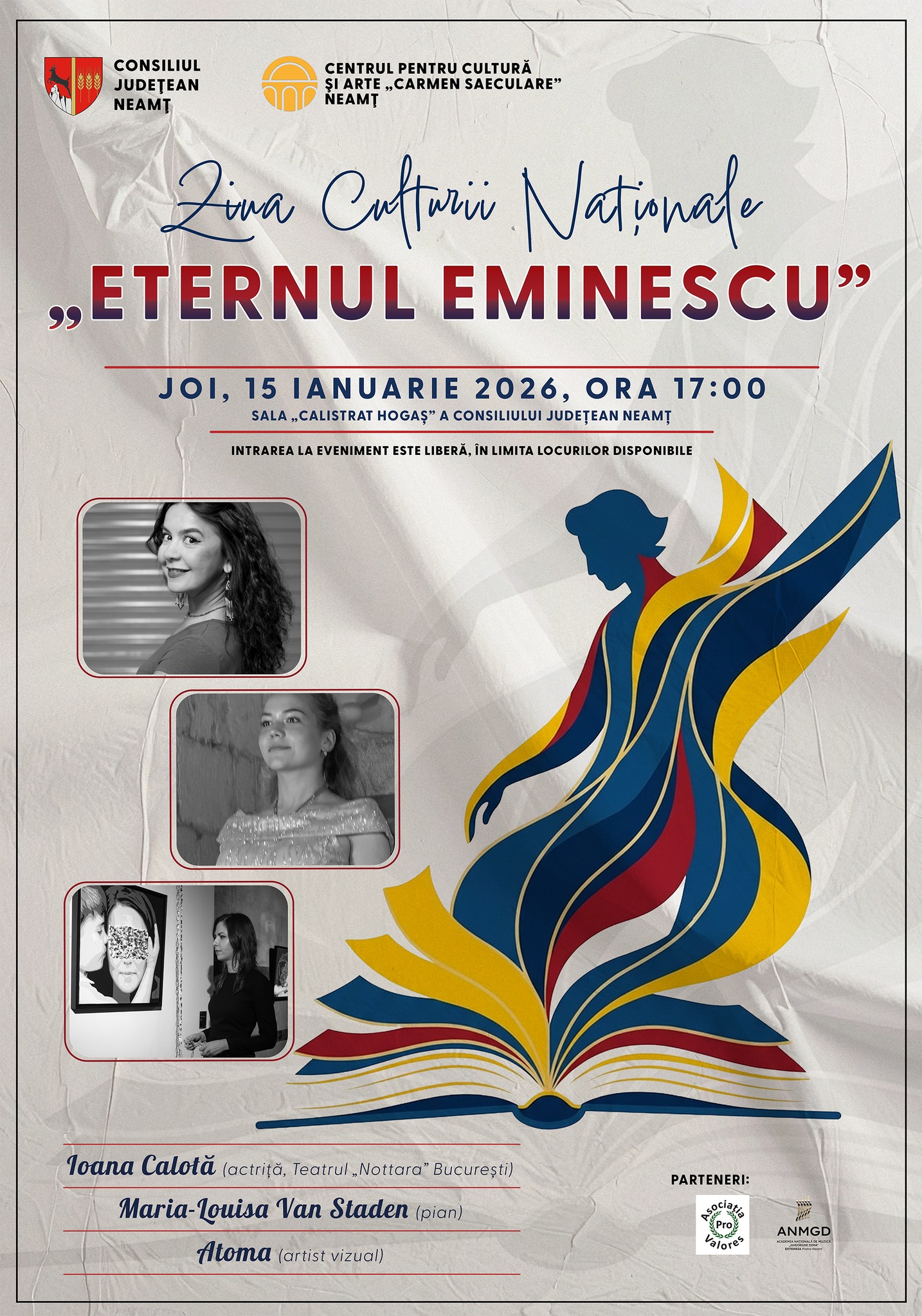 Evenimentul „Eternul Eminescu” este primul din seria de manifestări culturale pentru anul 2026 realizate de Centrul pentru Cultură și Arte „Carmen Saeculare” Neamț și este susținut în parteneriat cu Asociația Culturală „Pro Valores” și Academia Națională de Muzică „Gheorghe Dima” Cluj-Napoca, Extensia Piatra-Neamț. Pe scenă vor urca două artiste: Ioana Calotă, actriță la Teatrul „Nottara” din București, și pianista Maria-Louisa van Staden, originară tot din București.