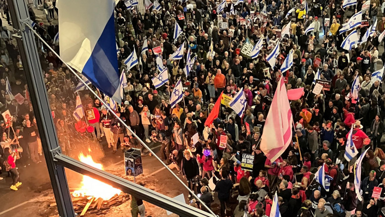 " Mii de oameni au ocupat străzile în orașul Tel Aviv cerând demisia premierului Benjamin Netanyahu și eliberarea ostaticilor din Fâșia Gaza.