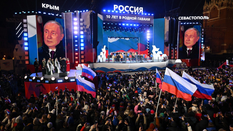 Vladimir Putin, liderul Rusiei, a aparut luni seara in Piața Roșie din Moscova pentru a sărbători victoria sa in alegeri, precum și 10 ani de la anexarea Crimeei. Mii de persoane au scandat pentru Rusia și au aplaudat când Putin a sosit pe scenă, unde a avut loc un concert și un miting.