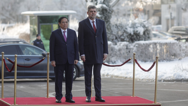 Pham Minh Chinh, Premierul din Republica Socialistă Vietnam, a fost întâmpinat cu onoruri de către Prim-ministrul Marcel Ciolacu în timpul vizitei oficiale în București, luni. Cei doi oficiali vor participa la o întâlnire tete-a-tete, urmată de o întâlnire a celor două delegaţii oficiale.